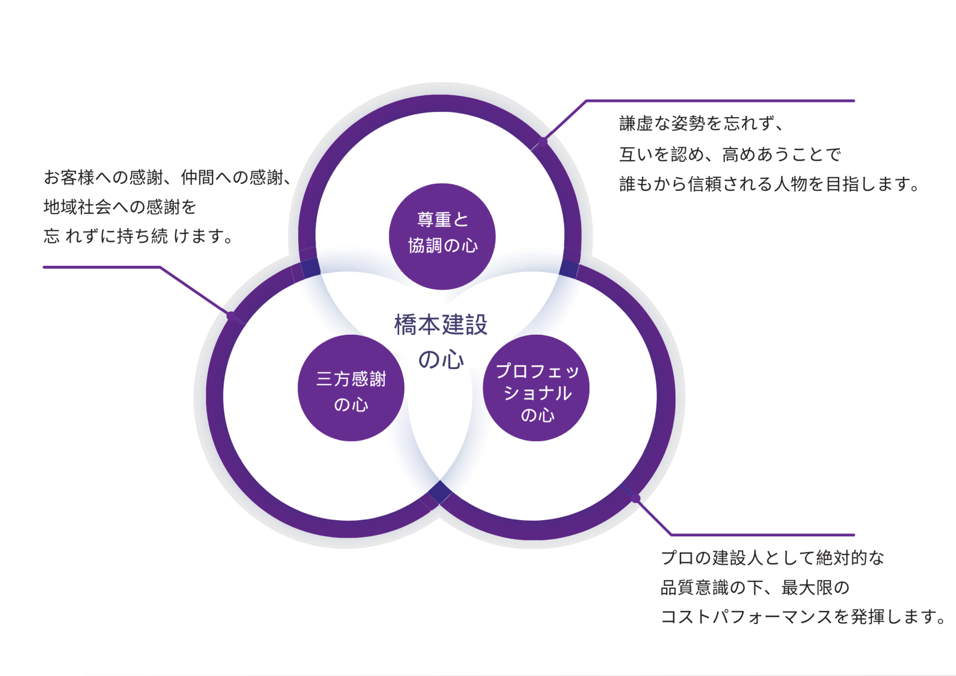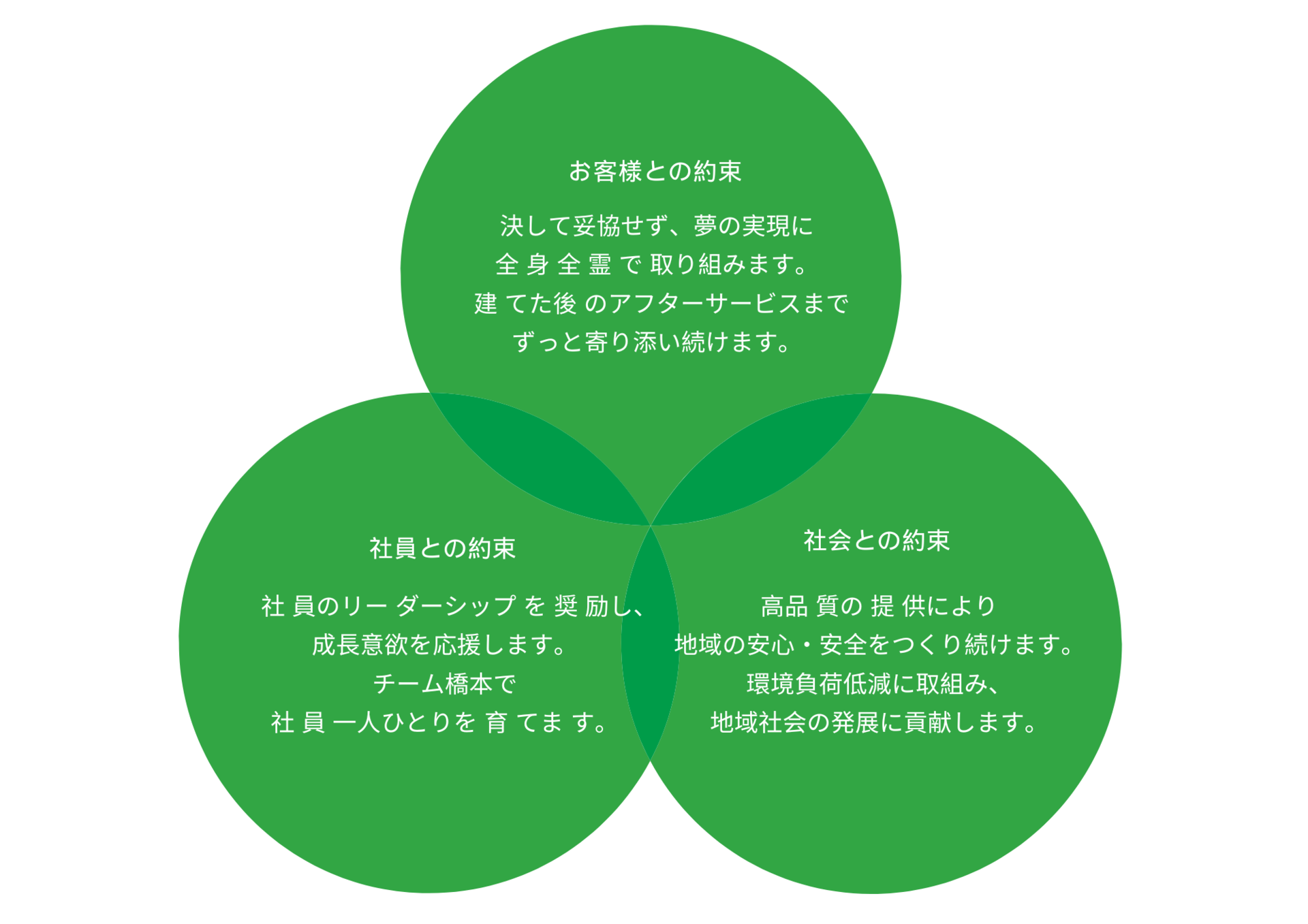貢献価値(パーパス)の実現に向けて、橋本建設は3つの約束を大切にし今後の業務に従事します。